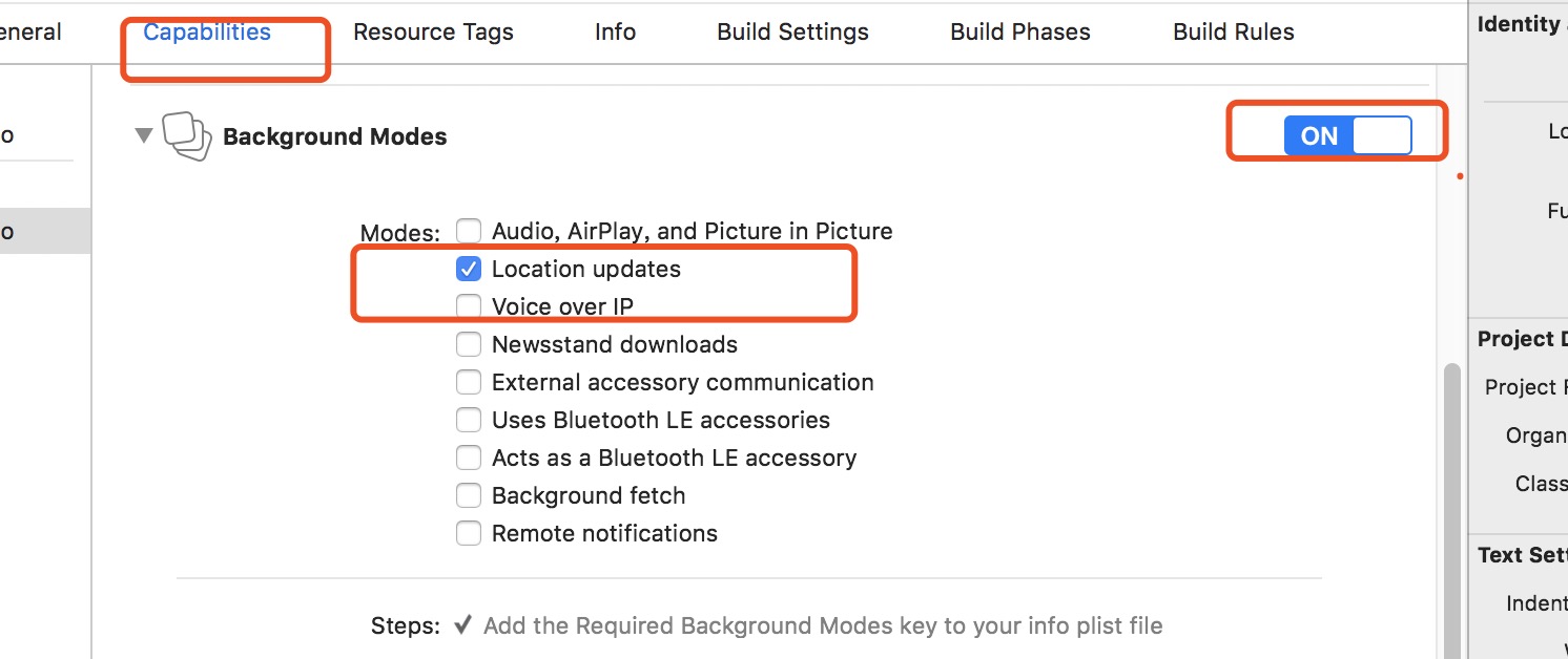 使用定位權限時,除了添加響應權限,還需要打開后臺位置更新: